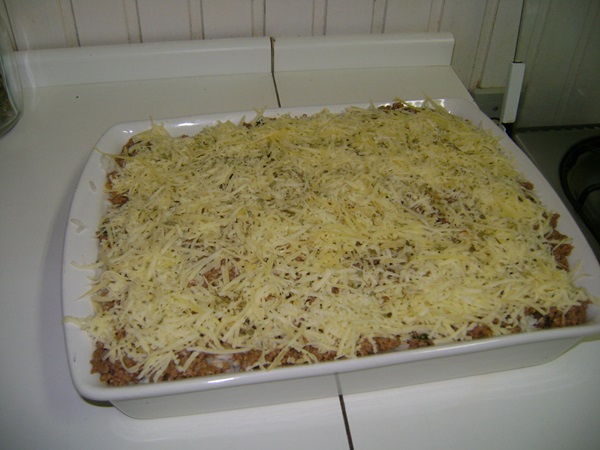 Coloque outra camada de arroz e em seguida de carne novamente, finalize com o queijo ralado grosso, leve ao forno preaquecido por 20 minutos