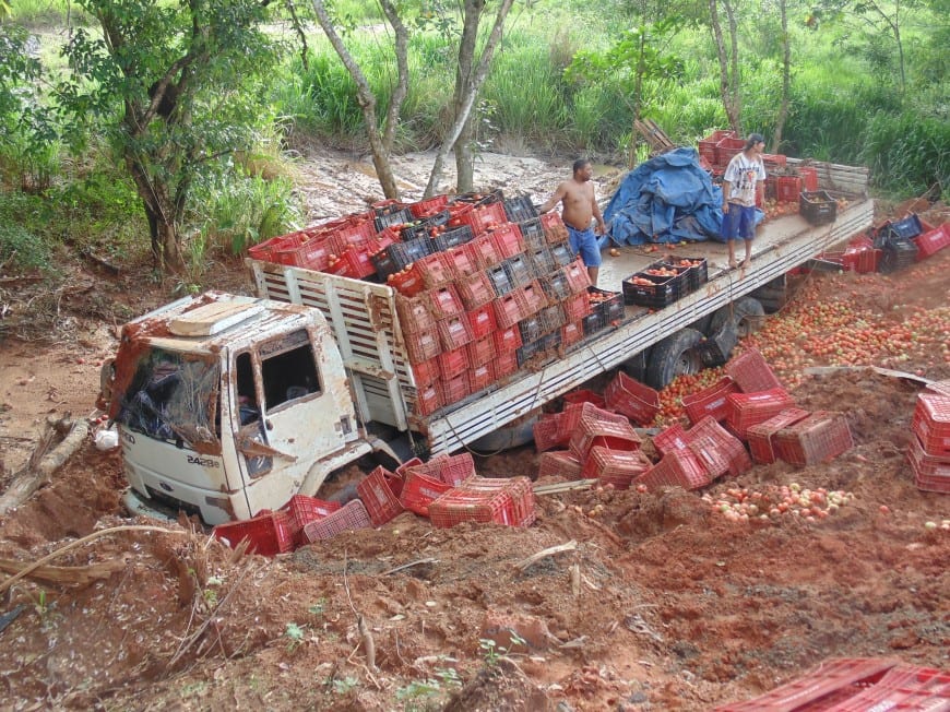 Um caminhão, placa LPI 3187/Teresópolis, carregado com 470 caixas de tomates, tombou na tarde desta quarta-feira (18), na RJ 220, na altura da localidade de Bananeiras, Natividade. De acordo com o motorista do caminhão, que pediu para não ter o nome divulgado, ele seguia de Guaçuí (ES), onde havia pegado a carga e seguia para Teresópolis, região Serrana, quando a lateral da pista, que está em obras, cedeu e o veículo caiu em uma região de barranco.