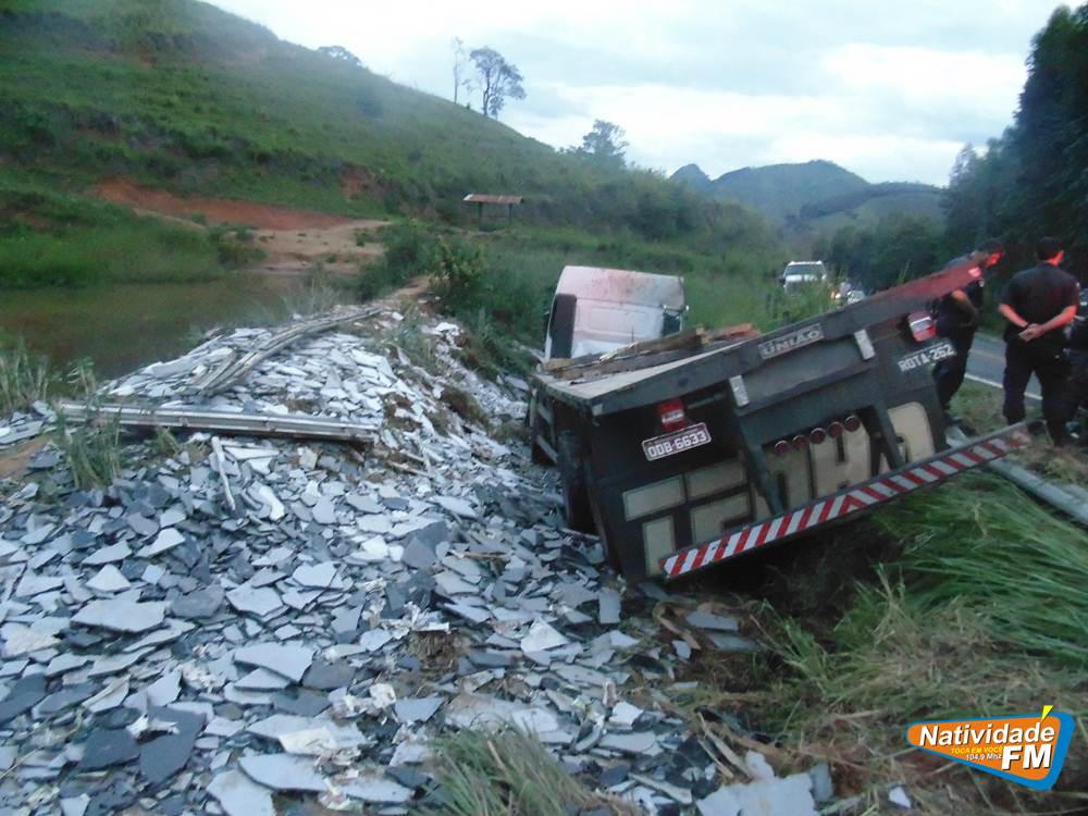 Um caminhão Volkswagen, placa OBD 6633/Cachoeiro de Itapemirim, carregado com placas de granito, tombou na RJ 214, no trecho entre Natividade Varre-Sai, na altura da Fazenda Bela Vista.