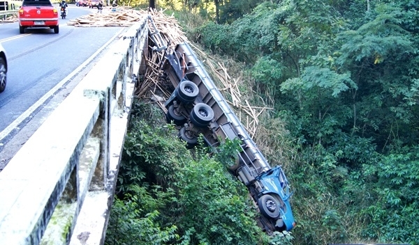 Um caminhão carregado com toras de madeira e uma carreta vazia, ambos com carroceria aberta, se chocaram e desceram pelo mato, na curva da chamada “Ponte do Muratori”, no trecho BR-356 entre Muriaé (MG) e Itaperuna, nas proximidades do trevo de acesso a Patrocínio do Muriaé, no início da manhã desta terça-feira (21).