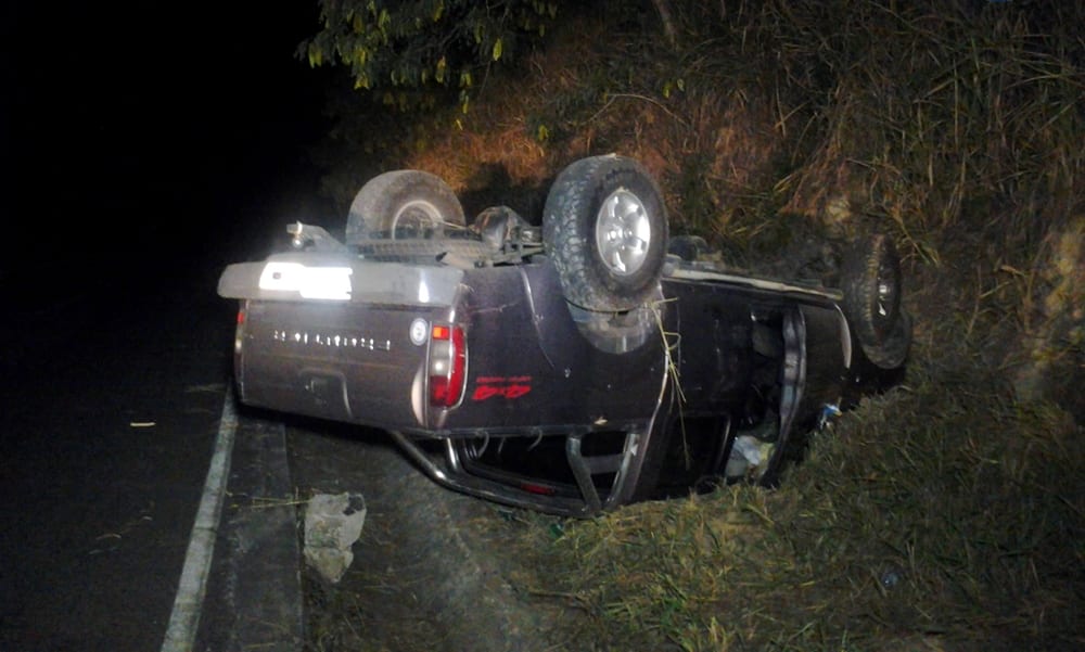 Um casal escapou sem ferimentos de um acidente de trânsito ocorrido no começo da noite deste domingo (15), na rodovia estadual RJ-158, na subida do Morro do Gambá, São Fidélis. De acordo como o condutor, Vanderlei Faria Moraes, de 54 anos, ele seguia juntamente com sua esposa de Miracema, em direção a Campos dos Goytacazes, quando ao passar pelo Km-145, teria perdido o controle da sua camionete Nissan Frontier e capotado, parando com veículo entre a vala de escoamento de águas pluviais e o barranco. O Corpo de Bombeiros chegou a ser acionado, mas por não se ferirem, recusaram atendimento. O motorista é proprietário da Boate Mustique de Miracema.