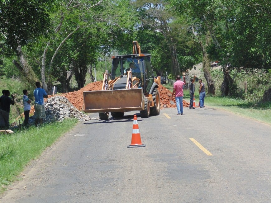 No entroncamento com a BR 356, máquinas e homens trabalham no serviço de terraplanagem do acostamento. Alguns quilômetros depois, nas proximidades da usina de asfalto (foto acima), na localidade de Serraria, a rodovia foi contada ao meio para a instalação de manilhas de escoamento de águas pluviais. Em ambos os locais, foi adotado o sistema pare e siga.