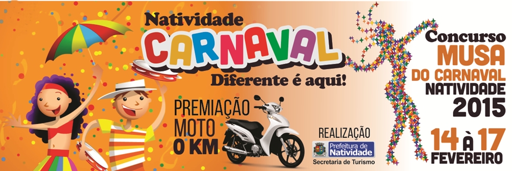 Já estão abertas as inscrições para o Concurso da 1ª Musa do Carnaval de Natividade 2015, realizado pela Prefeitura de Natividade, através da Secretaria Municipal de Turismo. A premiação para a vencedora é de uma moto 0 Km. Para participar é necessário ser do sexo feminino, ter completado 18 anos de idade até dia 14/02/2015, ter idade máxima de 30 anos até o dia 17/02/2015 e ser residente no município.