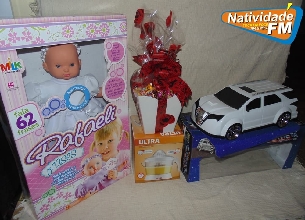Nas vésperas do Dia das Crianças, a Rádio Natividade lança uma promoção válida para todas as idades. Concorra a uma boneca que fala 62 frases, uma réplica de caminhonete para os meninos, um espremedor de frutas, CD do padre Alessandro Campos, dois ingressos para show da Paula Fernandes, dia 17 de outubro em Itaperuna, além de uma cesta de chocolates, conforme a foto logo acima. O sorteio será nesta sexta-feira (09), no Programa Show da Manhã.