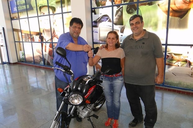 Elmo Guimarães Filho retirou a moto que a esposa Marilena da Natividade Medeiros Pereira Guimarães ganhou no sorteio.