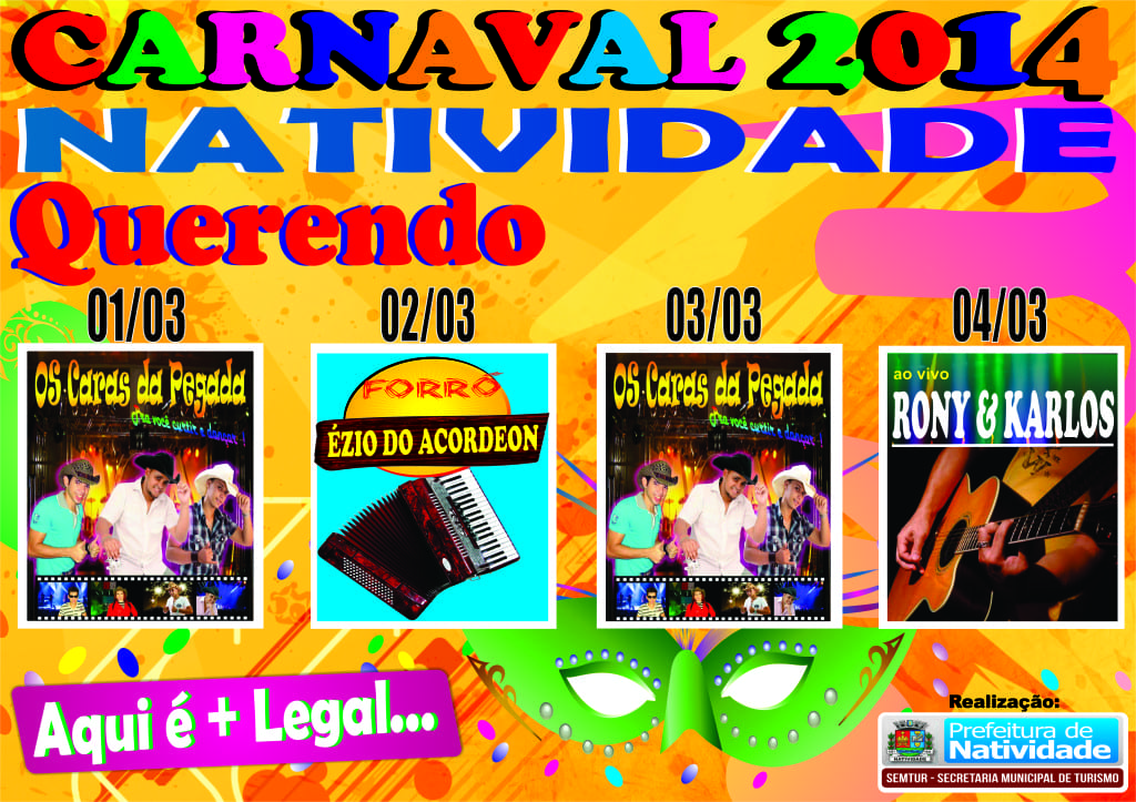 A Secretaria Municipal de Turismo divulgou a programação de carnaval no distrito de Bom Jesus do Querendo. Serão três grupos que irão se revezar durante os quatro dias de folia. Confira a programação acima: