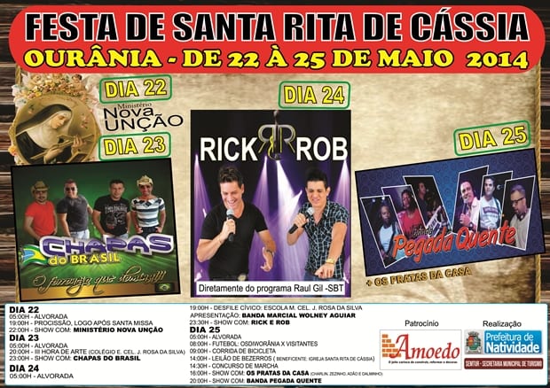 Começa nesta quinta-feira (22) e segue até o domingo (25), a tradicional Festa de Santa Rita de Cássia do distrito de Ourânia. Confira a programação acima: