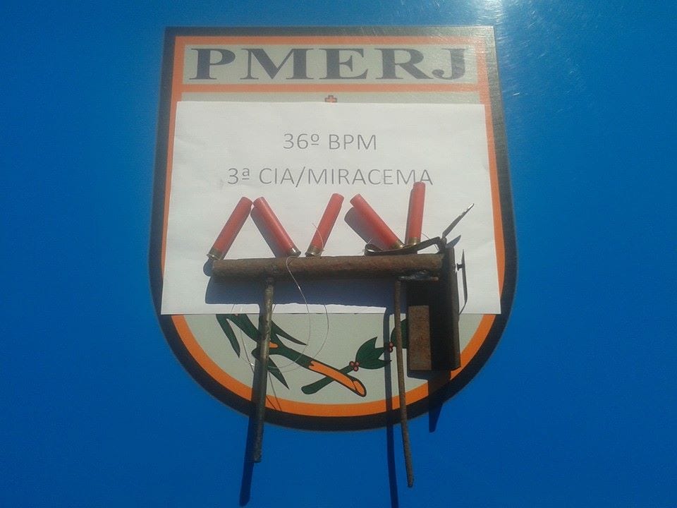 Policiais Miliares do 36º BPM/Pádua ao verificarem denúncia na estrada vicinal que liga o distrito de Paraíso do Tobias, Miracema ao município de São José de Ubá, localizaram uma arma de fogo de fabricação artesanal, popularmente conhecida por “trabuco”, geralmente usado em caça predatória, e mais 05 cápsulas deflagradas de cartucho calibre 36. O material que estavam escondidos às margens da estrada, debaixo de uma árvore, foi apreendido na delegacia.
