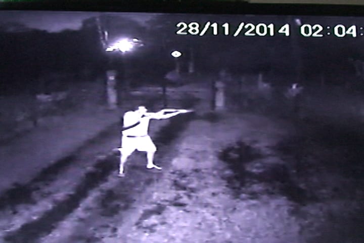 Câmeras de monitoramento da residência flagraram o momento em que o PM segue em direção ao portão de casa e efetua os disparos para se defender e defender sua família (foto acima). Segundo informações da Polícia Civil de Pádua, os disparos foram feitos por dois homens que estavam em uma moto, e passaram atirando contra o imóvel.