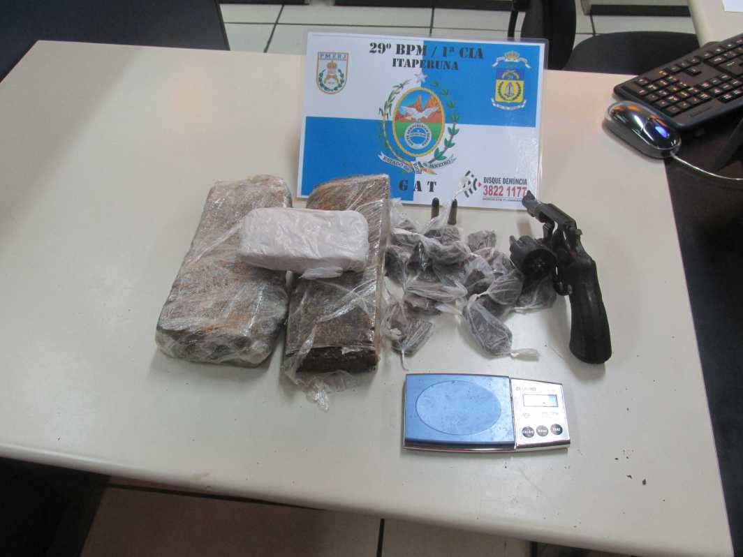 Dois homens foram presos e três menores detidos, durante operação da polícia militar de Itaperuna, que aprendeu um revólver calibre 38, além de cerca de três quilos de maconha, durante esta quarta-feira (29), no bairro Fiteiro, periferia da cidade.