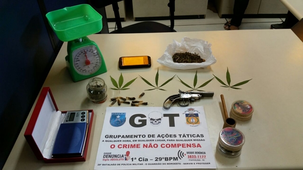 Além das plantas, os policiais encontraram 25,5 gramas da droga pronta para o uso, um celular, duas balanças, dois trituradores, um cachimbo e uma garrucha de calibre 22.