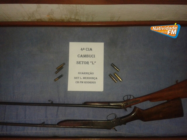 Duas armas e munições foram apreendidas durante o final da tarde deste domingo (08), na localidade conhecida como Valão do Padre, zona rural de Cambucí. Policiais militares da 4ª Companhia do 36º BPM se dirigiram ao local, após receberem denúncia anônima e ao abordarem um dos moradores, este admitiu possuir os artefatos, entregando aos agentes, duas espingardas calibre 28 e 36, além de seis cartuchos, todos deflagrados. O caso seguiu para a 142ª Delegacia e apresentado ao plantão da unidade.