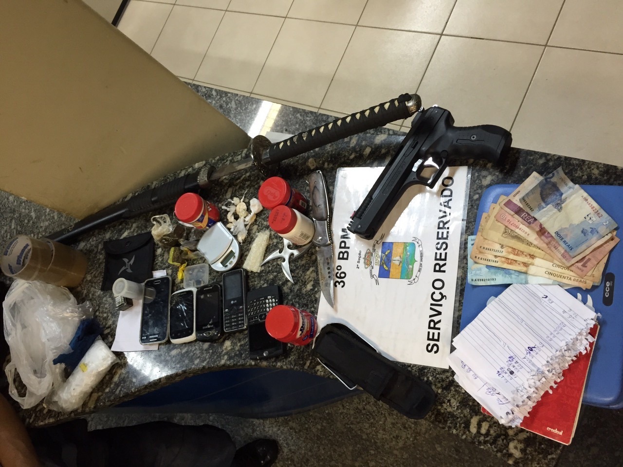 Foi obtido mandado de busca e apreensão em seu endereço, onde os agentes apreenderam uma réplica de pistola, uma espada e estrela ninja, balança de precisão, material para endolação de drogas, anotações e contabilidade do tráfico, cinco celulares, maconha, cocaína, além de dinheiro.