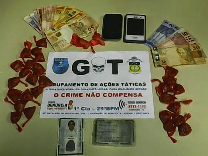 Dois jovens rapazes foram abordados, sendo apreendidas 27 buchas de maconha (67,6g), três pinos de cocaína (3,9g), R$ 608 em dinheiro, além de dois aparelhos de telefone celular. Os envolvidos foram levados à Delegacia Legal de Itaperuna, onde I.T.M., de 20 anos, foi liberado após o registro de ocorrência. Já Cássio da Silva Oliveira, 24 anos, após ser autuado por tráfico de drogas, seguiu para a Casa de Custódia da cidade.