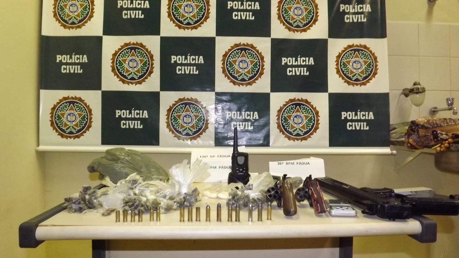 Seis pessoas foram detidas, entre eles dois menores, durante operação deflagrada pelas Polícias Militar e Civil de Santo Antônio de Pádua, durante a madrugada desta quarta-feira (19). A ação conjunta foi deflagrada nos bairros Rodoviária e Cidade Nova. Em diversos endereços, os agentes apreenderam aproximadamente cem gramas de crack, dois revólveres, munição, além de replicas de uma pistola e uma metralhadora, balança de precisão, radiocomunicador e caderno com anotações do tráfico. Os suspeitos seguem prestando depoimento aos inspetores da 136ª Delegacia Legal.