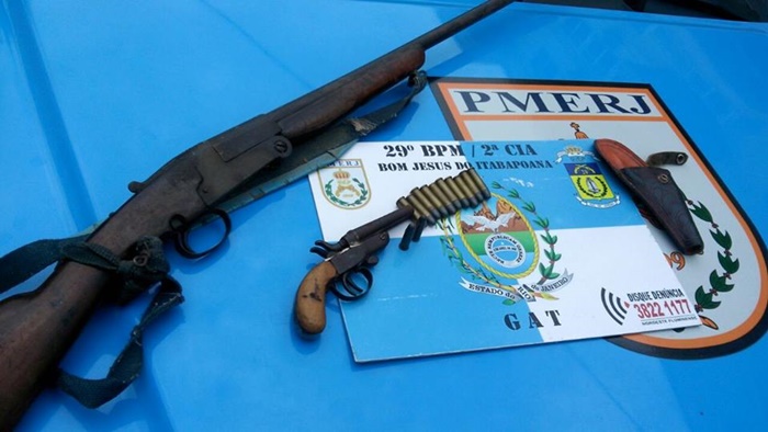 Duas armas de fogo e munições foram apreendidas por policiais militares na Fazenda Monte Azul, zona rural de Bom Jesus do Itabapoana, durante este domingo (08). Os agentes receberam denúncia anônima e seguiram para o local, onde o lavrador J.A.S., de 41 anos, confirmou possuir os artefatos, que foram encontrados no interior de sua residência.