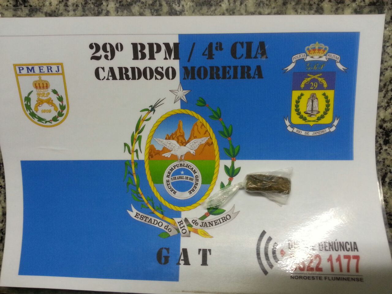 Duas pessoas foram detidas e conduzidas até a 148ª Delegacia Legal de Italva, após terem sido flagradas com um pequeno tablete de maconha, durante o final da noite desta quarta-feira (08), no bairro Cachoeiro, Cardoso Moreira. Policias militares do 29º BPM, realizavam patrulhamento de rotina, quando desconfiaram dos suspeitos, que estavam no interior de GM/Vecta.