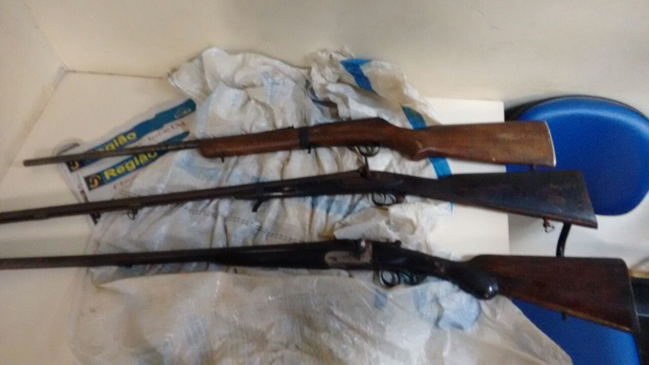 Policiais militares do 36º BPM aprenderam três espingardas de calibres variados durante a noite desta terça-feira (24), na Manoel Fernandes Vaz no bairro Alfa Ville, Santo Antônio de Pádua.