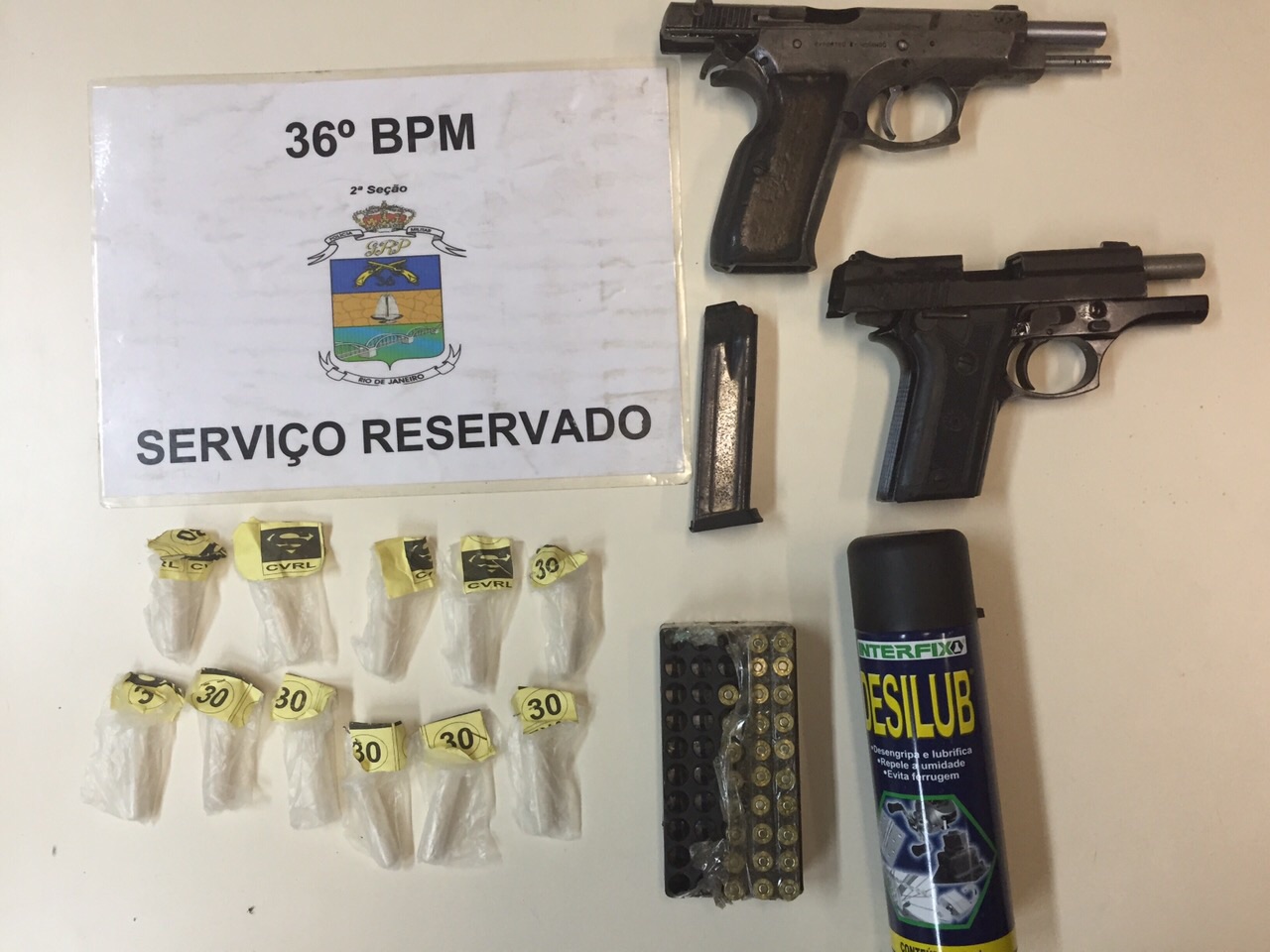 Minutos depois, já no interior da residência do suspeito, na Rua Genocy Coelho da Silva, localizaram duas armas, sendo uma pistola nove milímetros de fabricação chinesa, outra calibre 380, 28 munições e mais oito pinos da mesma droga.