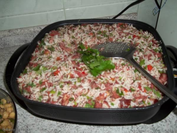 - Tampe a panela e cozinhe em fogo baixo por 30 minutos ou até o arroz ficar macio