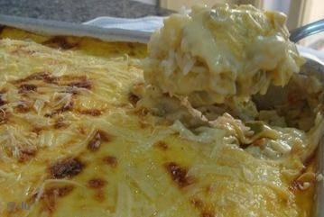 - Então em um refratário médio faça a montagem do prato, coloque primeiro o arroz, depois o creme de leite e o espalhe, em seguida o frango no molho e espalhe, depois requeijão cremoso, presunto, queijo e para finalizar a batata palha