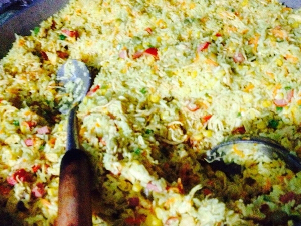 - Adicione o milho sem a água, a ervilha, a cenoura e deixe fritando, por último acrescente o ovo cozido em pedaços e o arroz cozido com açafrão