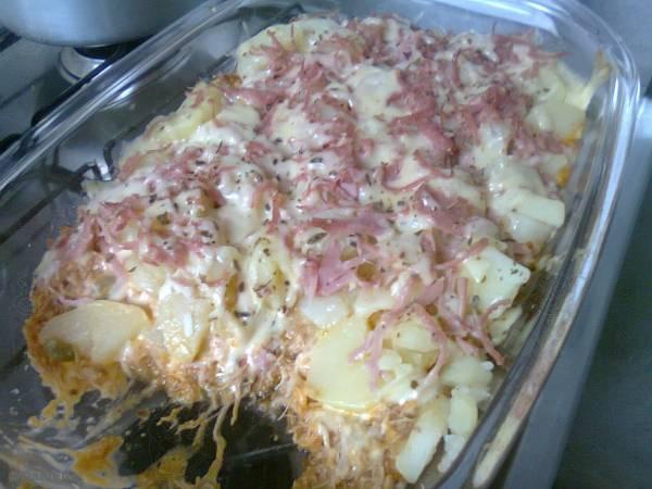 - Logo em seguida coloque o requeijão por cima do frango e depois as batatas cozidas em rodelas