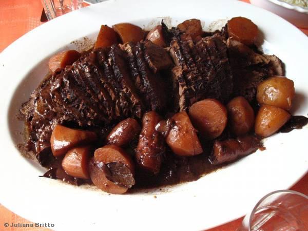 - Adicione batatas couradas e leve ao forno por 10 minutos para dourar as fatias da carne