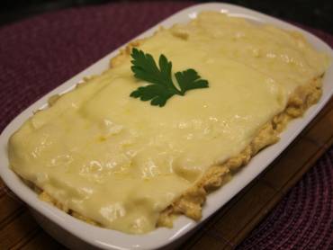 - Depois, coloque em uma forma refratária, cubra co algumas fatias de mussarela e deixe por 5 minutos em fogo baixo no forno