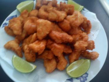 - Passe o frango na farinha de trigo seca, depois passe na massa de cerveja e coloque para fritar em óleo quente