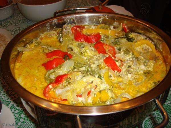 - Numa panela grande arrume o peixe, a cebola, os pimentões e os tomates