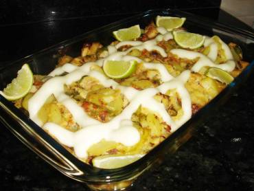 Arrume as postas, as batatas e o molho em uma travessa