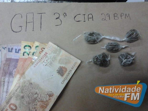 Um adolescente, de 16 anos, foi flagrado por policiais militares, de posse de uma bucha de maconha, nas proximidades do terminal rodoviário de Natividade. De acordo com informações da polícia, uma viatura realizava patrulhamento de rotina, após ter desconfiado da atitude de três menores, sendo que no momento da abordagem, em deles, teria escondido a droga na janela de uma residência próxima, fato notado pelos agentes.