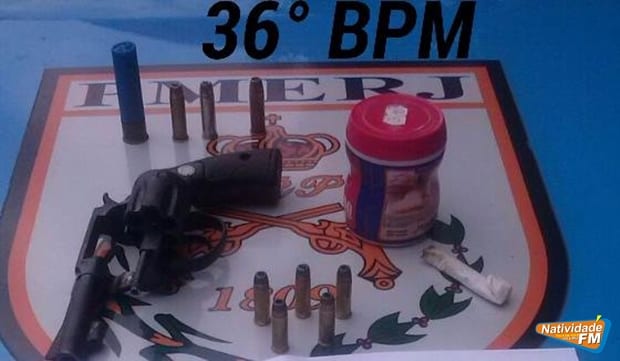 Com eles, os militares arrecadaram um revólver calibre 32, com cinco munições intactas, quatro projéteis calibres 38 e 28, um tablet, um frasco com “cheirinho da loló”, além de um pote de pó royal, substância muito usada na mistura com cocaína (foto acima). O caso seguiu para registro na 136ªDelegacia Legal.