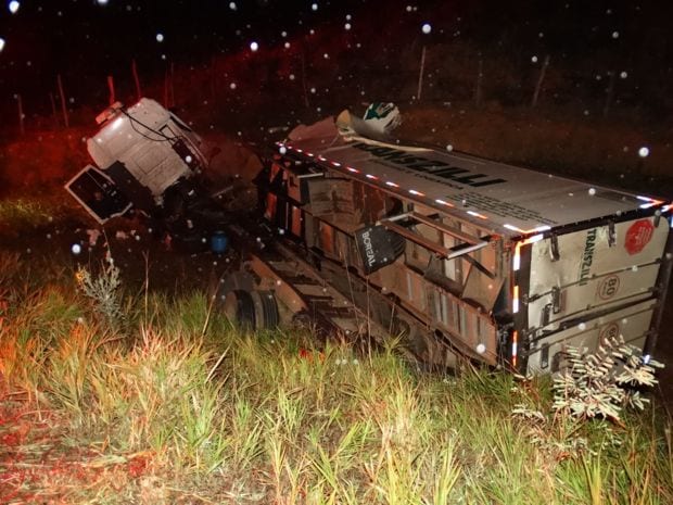 Uma carreta Mercedes Benz, com placa de Itumbiara (GO), tombou durante a tarde desta quinta-feira (27) na altura do quilômetro 50 da BR 356, nas proximidades do Cruzamento de Bom Jesus.